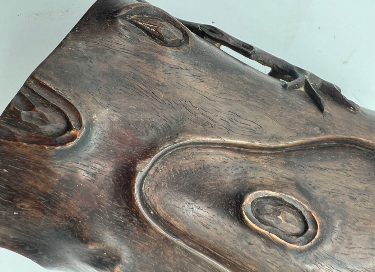 Carved from a single piece of rosewood, with a wonderful surface patina. The underside is most fascinating where the base is patch with a piece of horn.