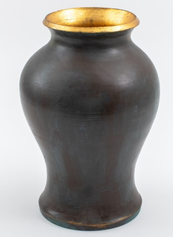 An impressive and elegant vase with an almost metallic, matte glaze on the exterior and a gold glaze on the inside. Signed at the rim at the foot of the vase.