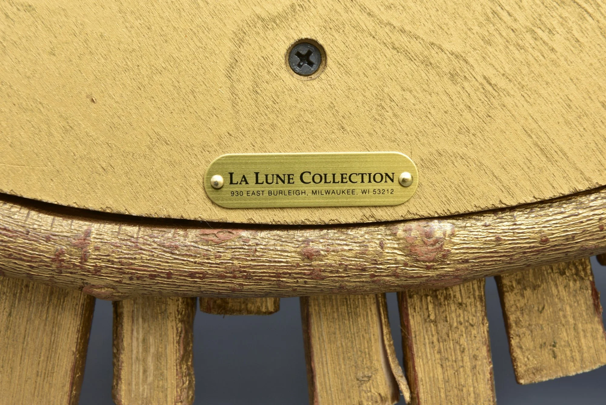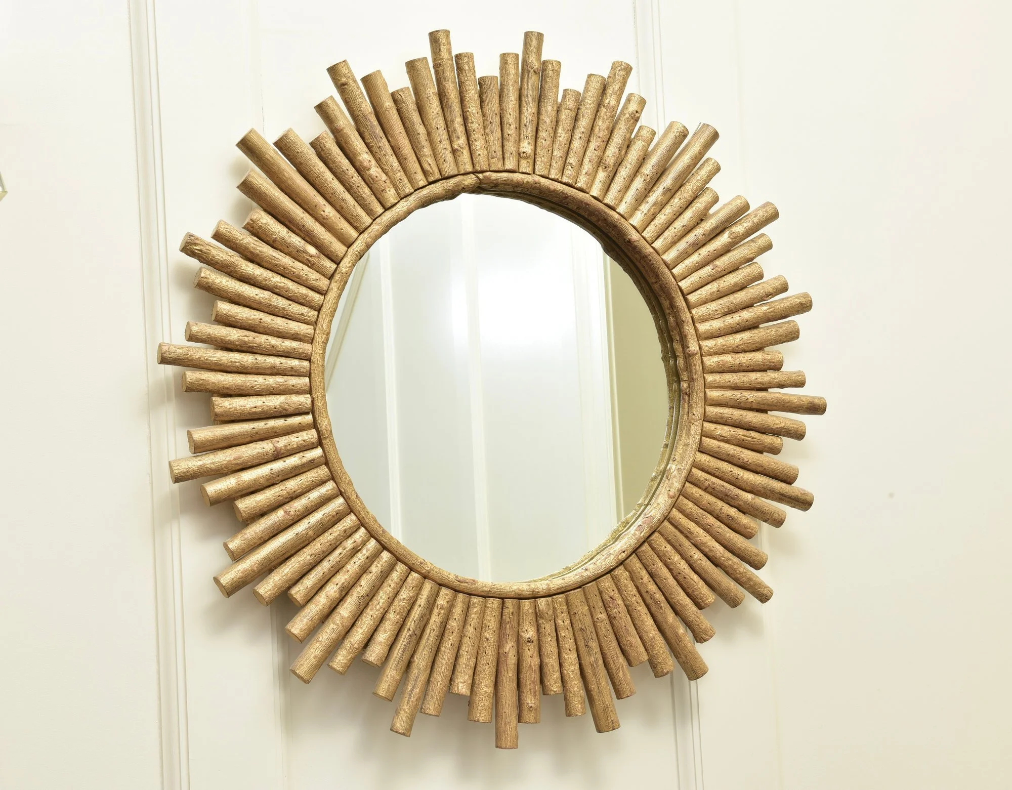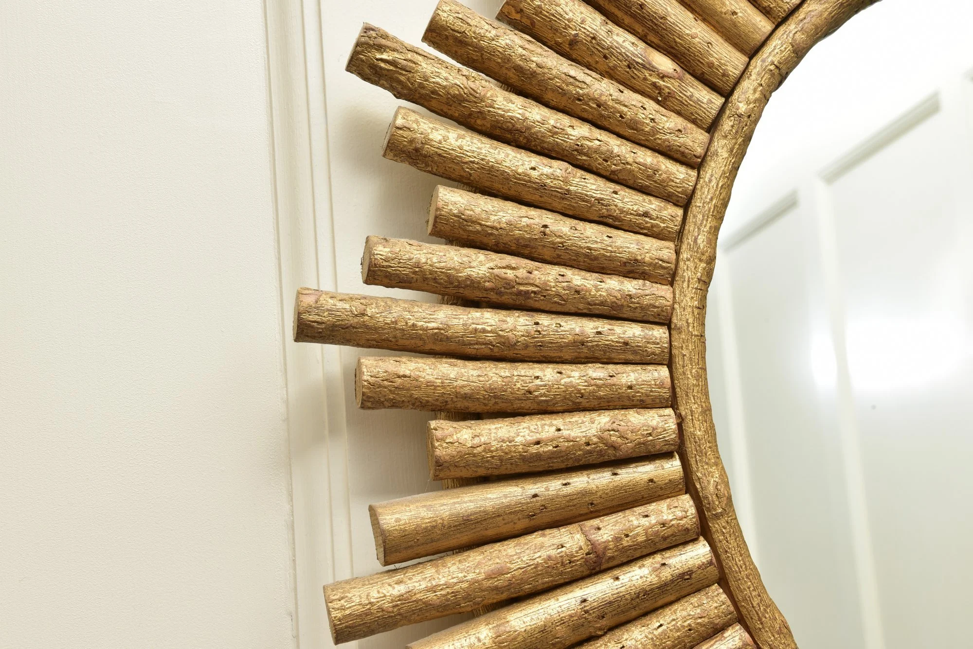 This elegant but rustic round mirror is a vintage piece from La Lune Collection. In a sunburst round shape, the frame is composed of gilded twigs