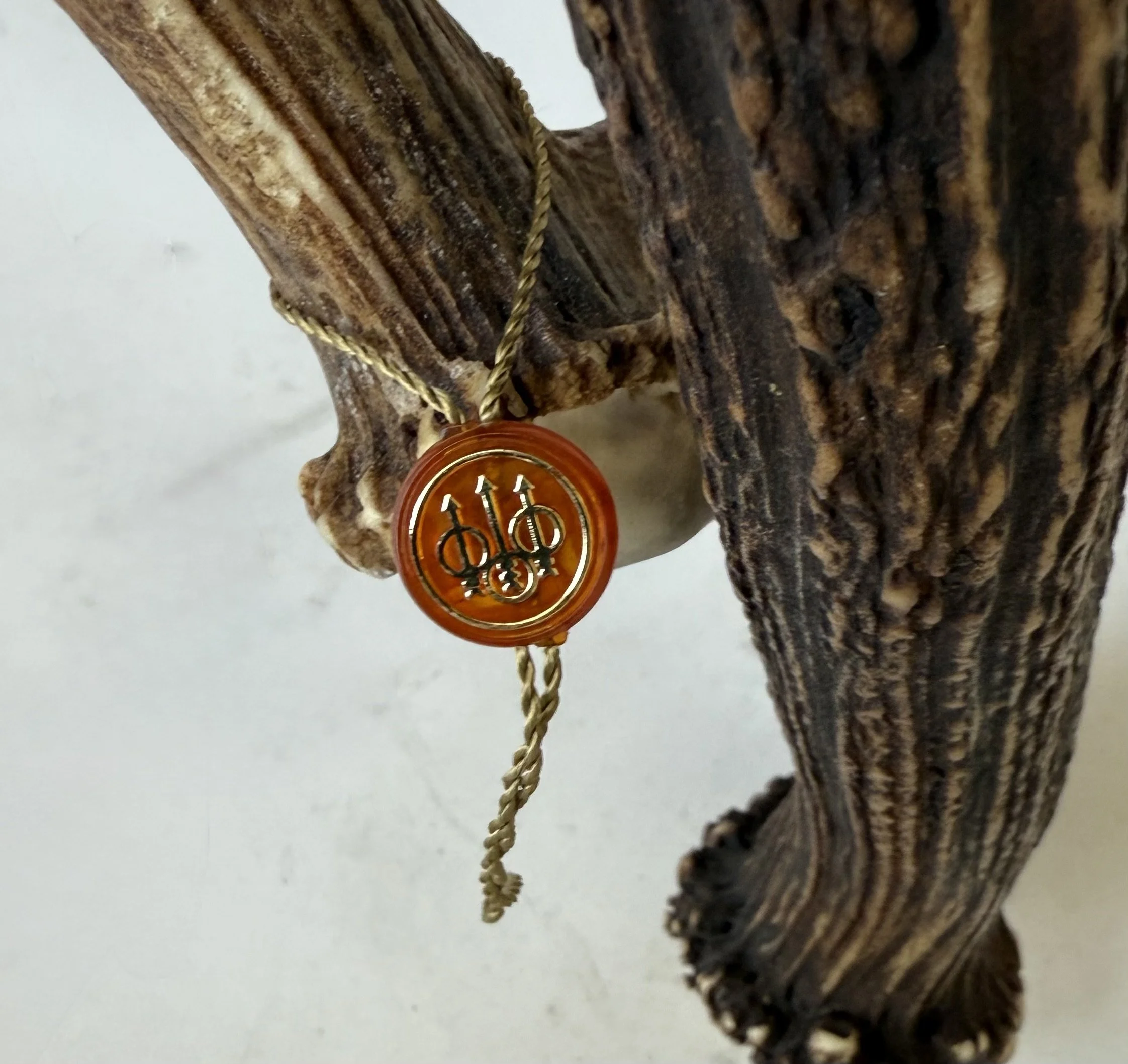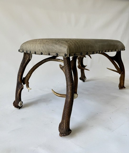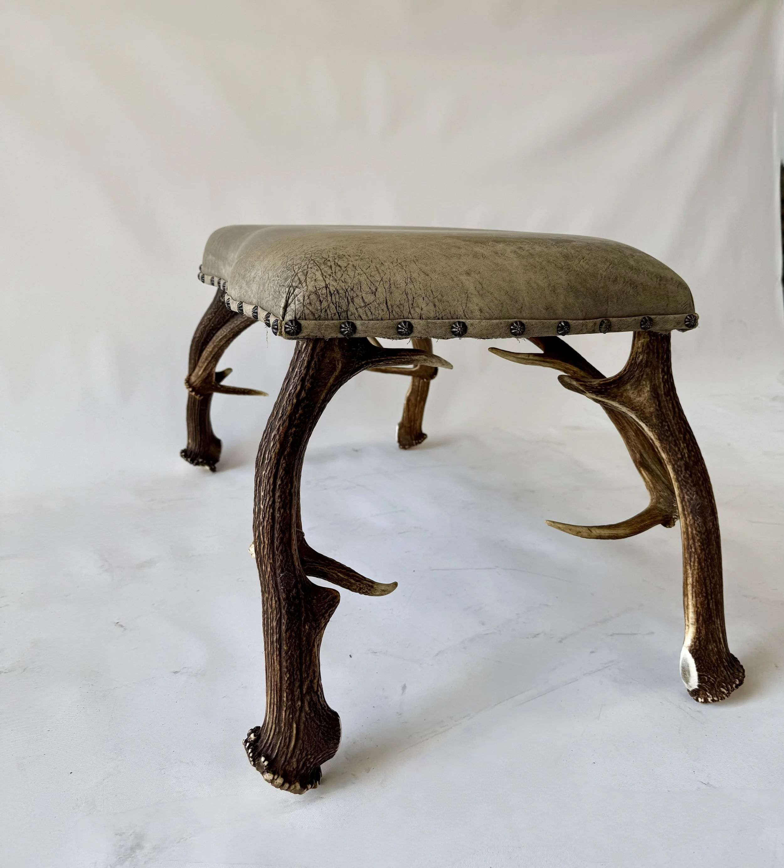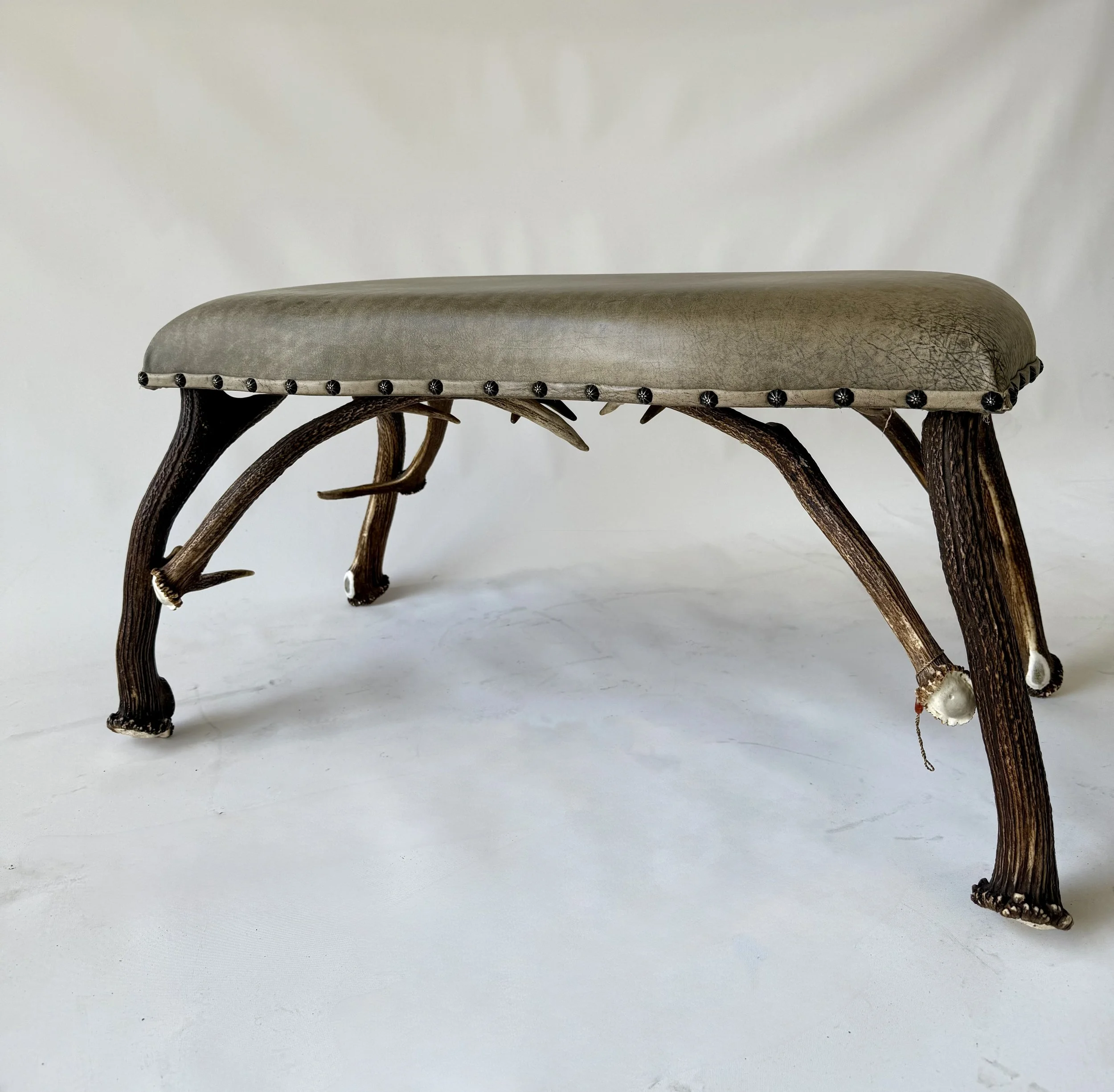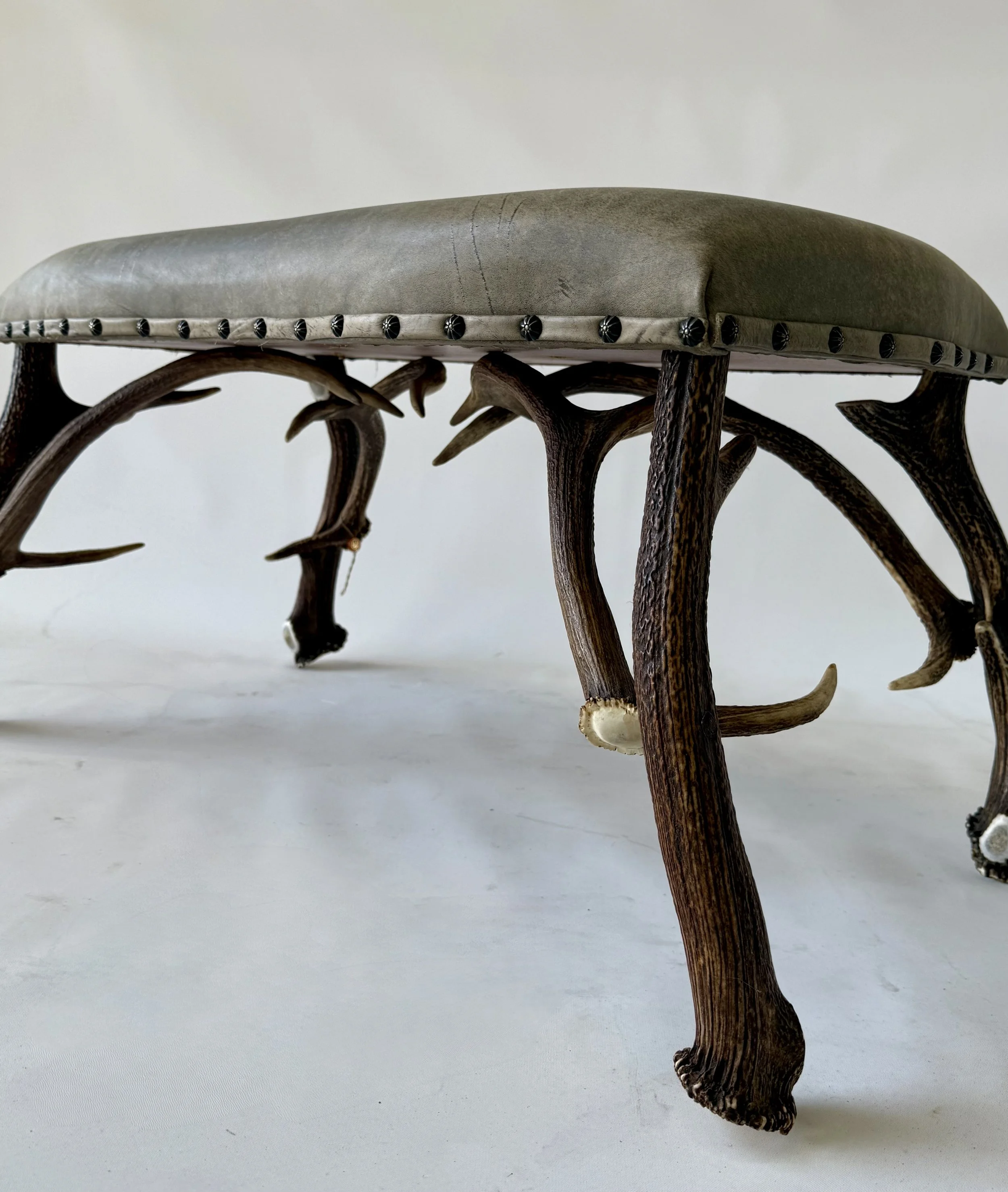 A perfect sized bench for a small entrance hall, in front of fireplace or as extra seating. The distressed moss colored leather top is finished with nail head trim and is supported on legs of gracefully arranged naturally shed elk antlers. Retains unidentified original tag