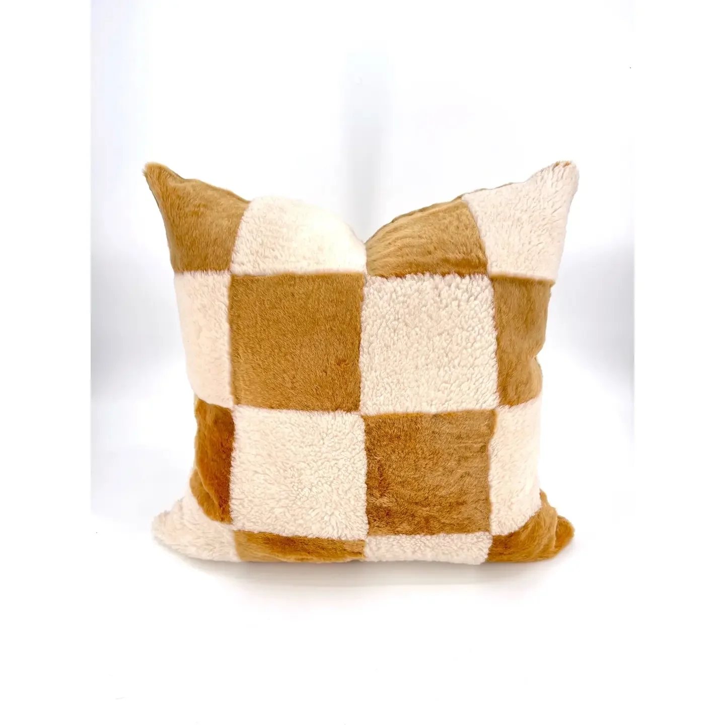 These whimsical yet luxurious pillow are made of two tones of shearling in a checkboard pattern.