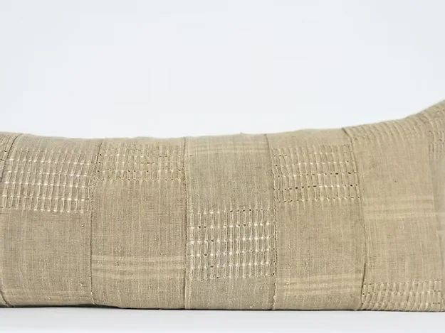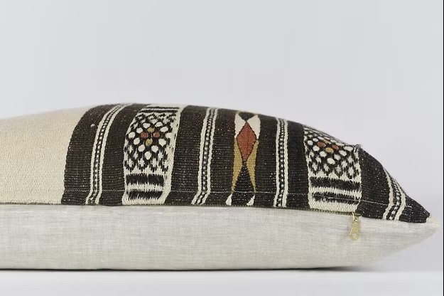 Pillow cover is made from Vintage Aso oke fabric imported from Africa.100% cotton. Pillow cover has as exposed brass zipper- A natural flax colored linen back. Down alternative insert. 14 inches high x 36 inches long