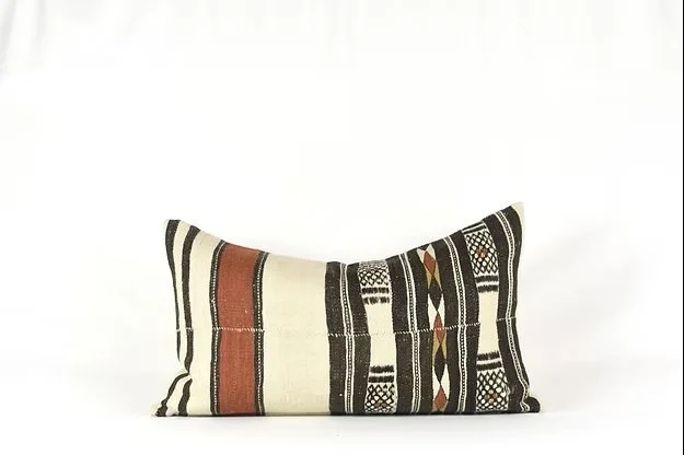 Pillow cover is made from a Vintage fulani fabric imported from Africa.100% woolC, slightly course in texture, ivory with black details and red stripe details. Textile is vintage so there will be inconsistencies with color.16 inches high x 26 inches wide